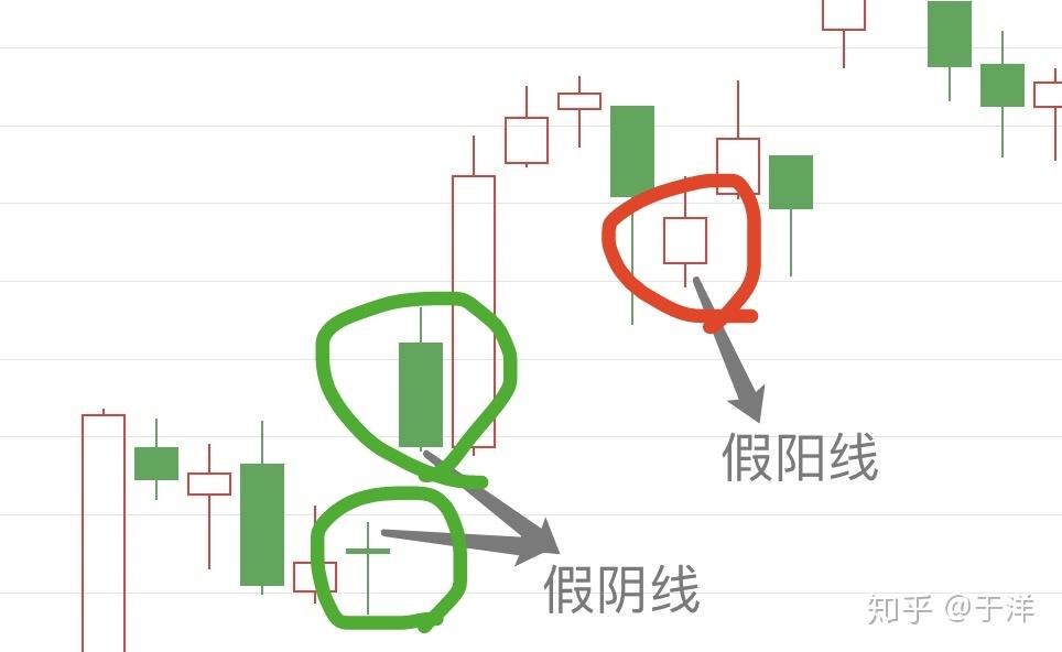 看下图两个绿框中的 K 线,很明显是阴线,收盘价低于开盘价,正常情况下是下跌的,但是,注意了,这两根 K 线的收盘价全部比各自前一天的收盘价要高,所以,当天的股价数值是「正」的,收盘价相对于昨天是上涨的,所以虽然是阴线,但实际却是上涨趋势,称为「假阴线」,表面是阴线,但实际上却相当于阳线。
