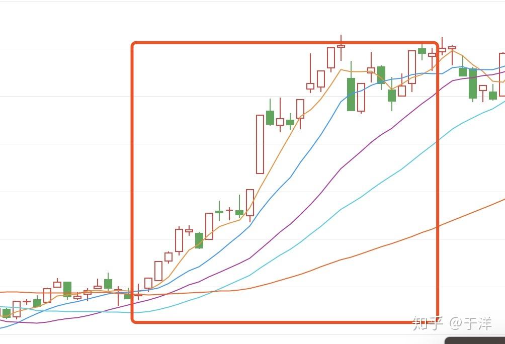 均线是一种趋势指标,因为是多个周期内的平均价格,所以某种趋势形成后,会延续一段时间,不会立马改变。当股价上涨一段时间后,大家可以想到,5 日均线价格肯定高于 10 日均线价格,10 日均线价格肯定高于 20 日均线价格,反映到图形上,就是「发散排列」,如下图从上到下依次是 MA5、MA10、MA20、MA30、MA60,这种时候行情一般比较强势,称之为均线的「多头排列」,就是买方力量比较强大,使得股价一路上涨。