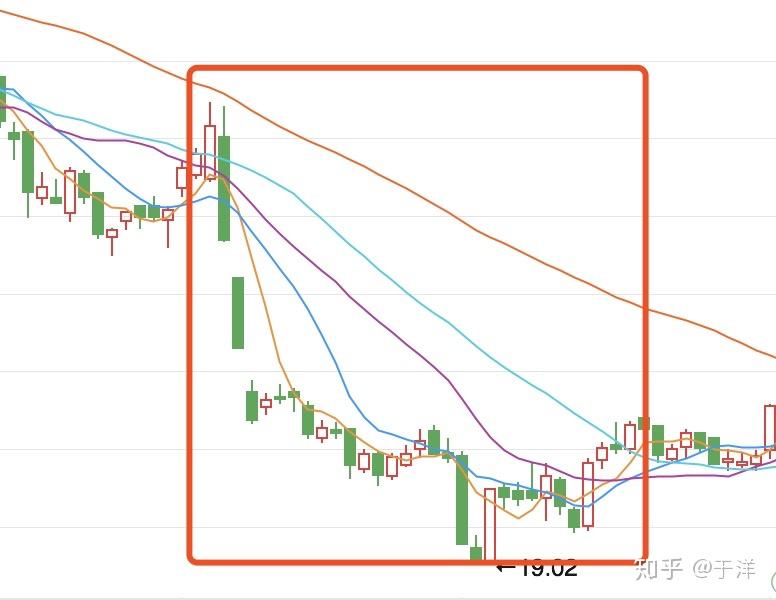 如果是下跌趋势中,均线便是「空头排列」,表示卖方力量比较强大,如下图,从上到下依次是 MA60、MA30、MA20、MA10、MA5,这种时候,在趋势的作用下,股价往往会下跌一段时间。
