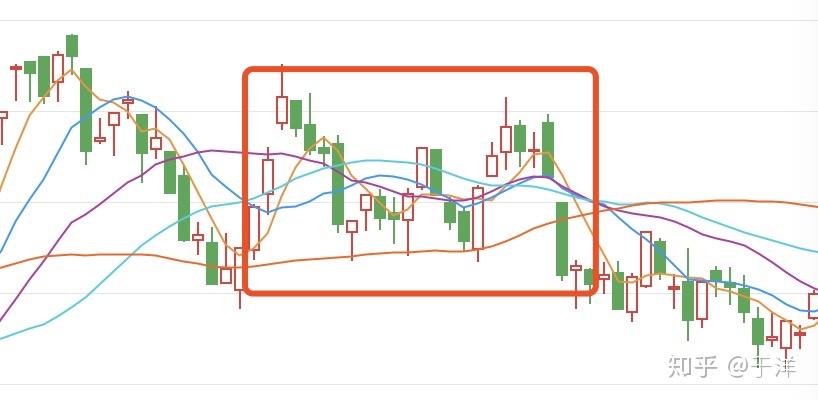 均线除了发散排列,也有「粘合」现象,就是众多均线缠绕在一起,表示行情比较胶着,短期方向不明,如下图所示。