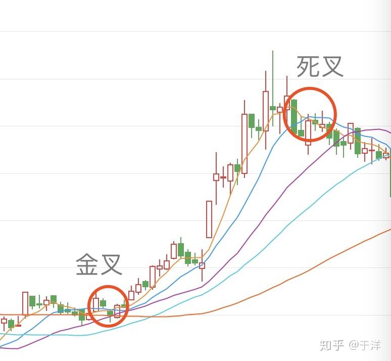有些技术派也会利用均线来寻找买卖点,比如短线交易者在 5 日均线向上穿过 10 日均线时买入,此时两条均线的交叉称为「金叉」,当 5 日均线向下穿过 10 日均线时卖出,此时两条均线的交叉称为「死叉」,市场上俗称「金叉买死叉卖」,这个大家知道就行,也是不建议这样用,因为失败概率太高。