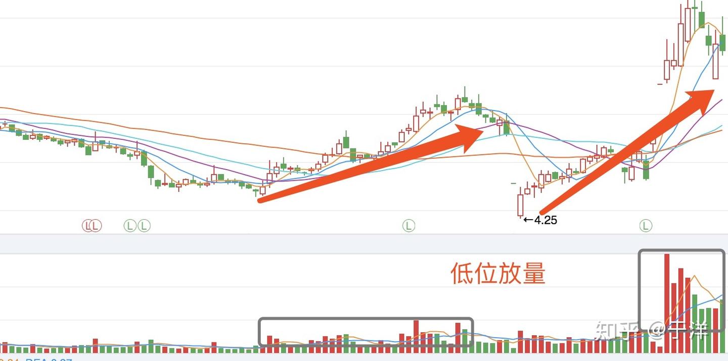 股票低位放量上涨。股票的上涨,必然是伴随着成交量的变大,因为只有买的人多了,股价才能上涨,这里说明下,说「买的人多」其实是不准确的,准确描述应该是「买的资金多」,因为有人账户可能几百上千万,有人可能几万块,他们对股价的影响肯定不一样的,供需关系实际上是「资金的买卖关系」,就是说有多少资金想买,有多少资金想卖,想买入的资金大于想卖出的资金,股价自然会涨,但由于「买的人」这样说便于理解,实际应用中这样说问题也不会很大,不会影响对于成交量的分析,只是不准确,大家知道就行。好,我们知道了股价上涨是因为买的人多,使得成交量变大,表现在图形上就是,股价与成交量的同步变大,一般都发生在股价上升期,比如下图,这个阶段是正常现象。