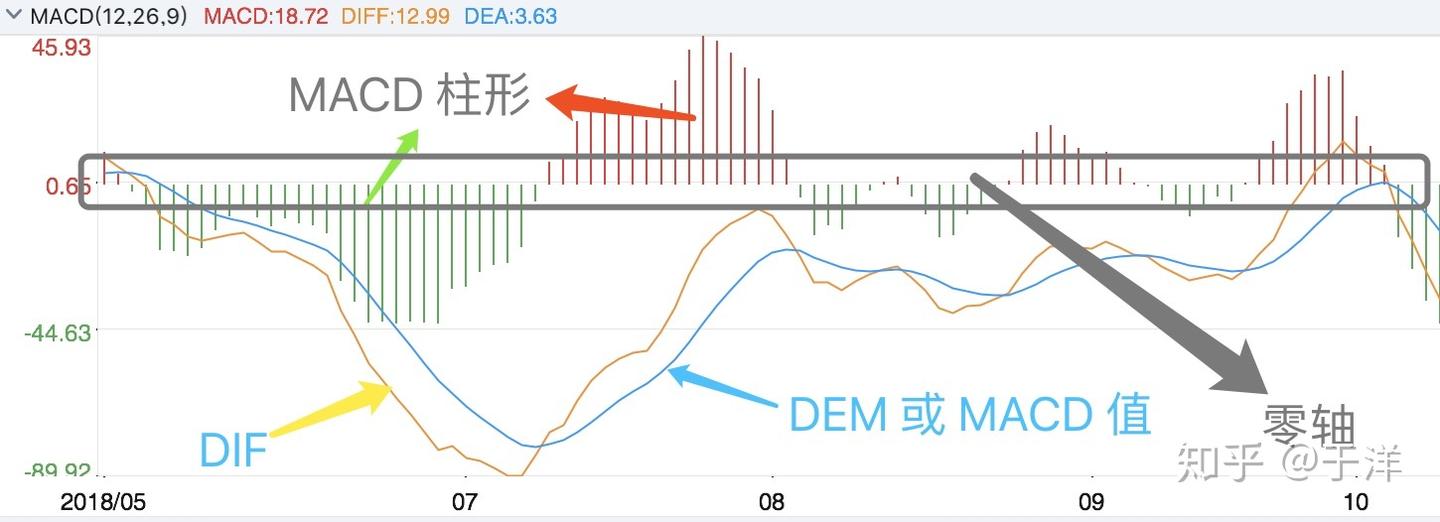 将 DIF 与 DEM 的差画成「柱形图」,即柱形图 = DIF - DEM,若为正,则是红色,若为负,则是绿色