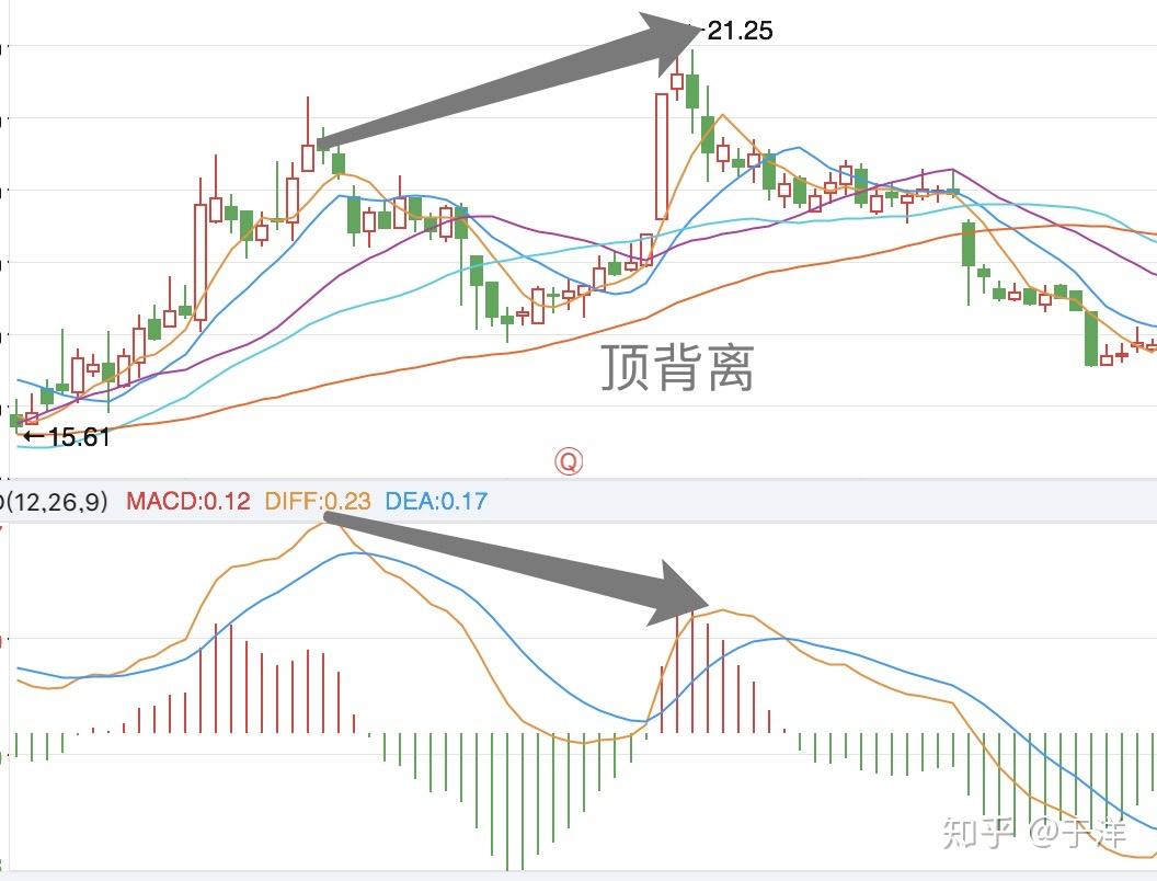 顶背离一般发生在股价连续上涨之后,代表股价的 K 线图持续走高,但是红柱之上的 MACD 图形却走低,这个时候往往预示着行情到达阶段性顶部,股价将要下跌,如下图所示。