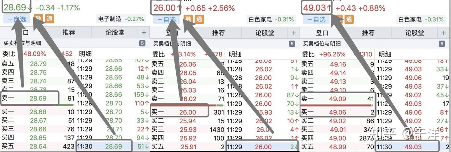 而股票的即时价格,就是该股票最后一笔的成交价格,这个价格可能是卖一或买一的价格,也可能是两者中间的一个值,如下图所示的三种情况。