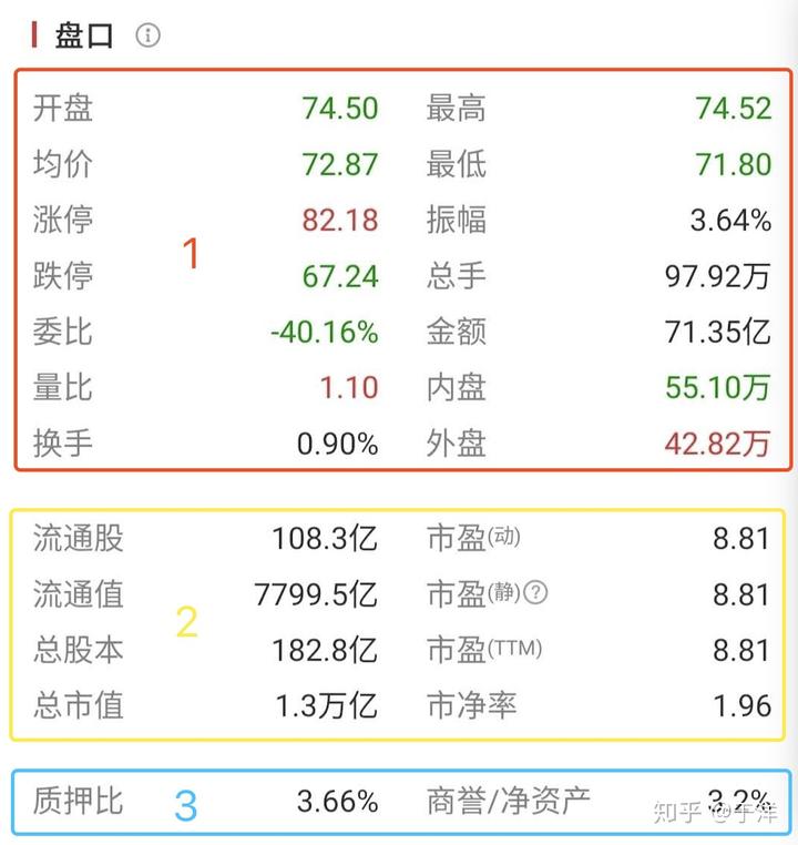同花顺手机版点击股票详情后,选择「盘口」一栏,下拉,就会看到下图中的内容,同样,咱们分三部分来讲,我已经用不同颜色与数字区分开。